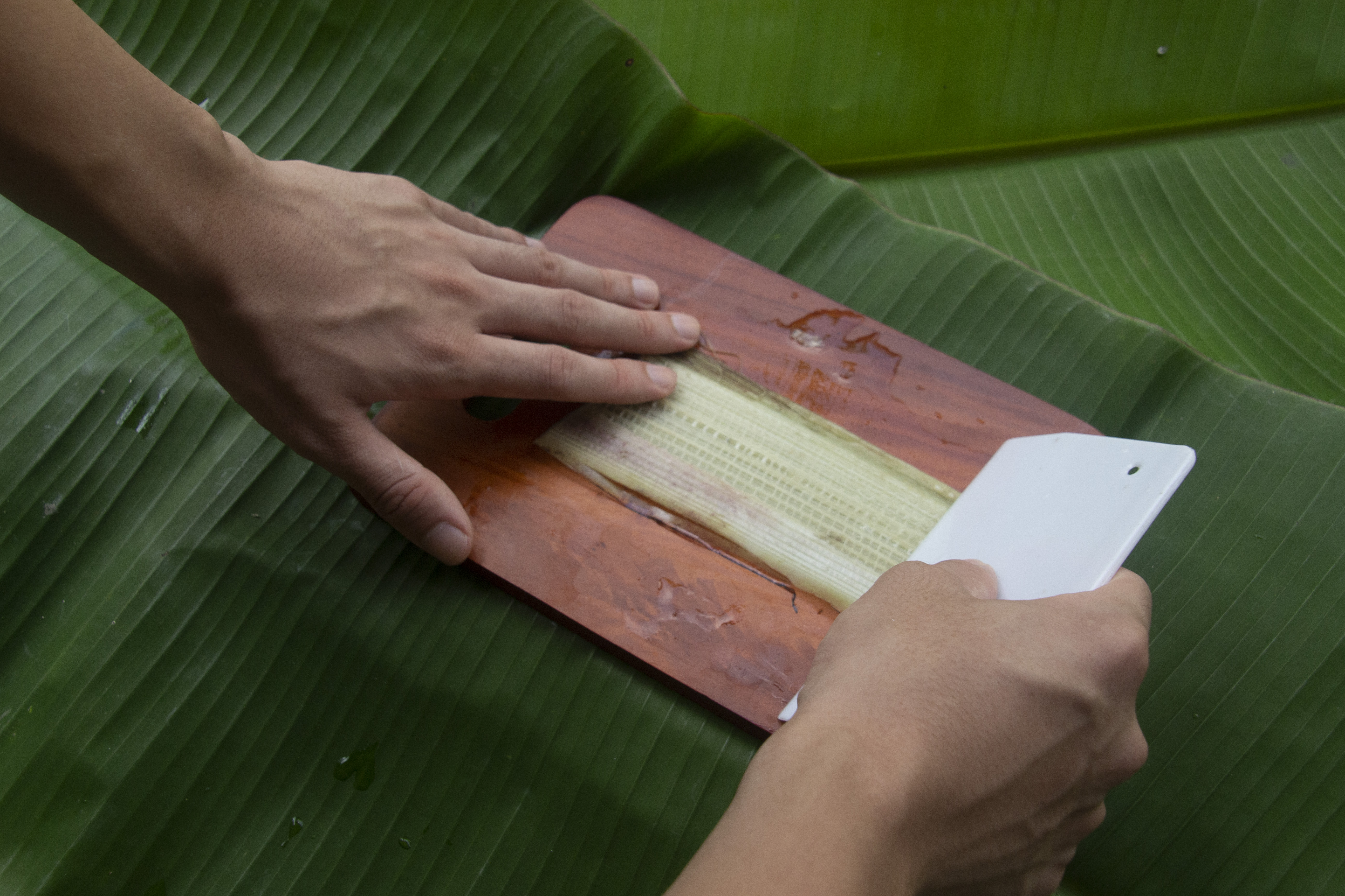 The project is an Investigation in different banana species offers a variety of fiber textures that could be applied to designs. If the fibers are widely used for the creative industry, a bigger range of banana varieties could be conserved. The project will benefit both species: fashion evolution helps humans conserve a diverse gene pool for bananas. The complex human and Musa relationship is mapped down and translated onto a wearable garment, just as textiles have done the job for story-telling for thousands of years. A performer would be dressed in the garment, and then demonstrate the instructions of the toolkit in eight stations. Six sets of FAUX-MUSA toolkits will be provided to the audience to take part in the process.